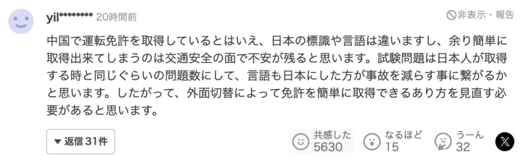 “雖然擁有中國駕照,但是日本的交通標識和語言都不同,如此輕易考到日本駕照,那麼在交通安全上真的會讓人感到不安。日本政府非常有必要重新審視這種通過‘外免切替’輕鬆獲得日本駕照的方式。我認為,相關考試的試題數量應該和日本人考試一樣,語言也應該使用日語,這樣有助於減少事故。”