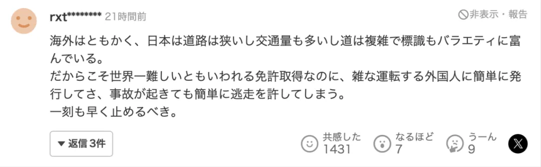 “先不説國外,日本道路狹窄複雜,而且交通量大,道路標識種類繁多。正因如此,日本駕照被視作是世界上最難考取的駕照之一。如今日本政府卻胡亂給外國人放寬標準,即便真的發生了事故,外國肇事者也能輕鬆脱罪。因此應該儘快取消這樣的做法。”