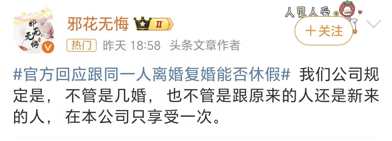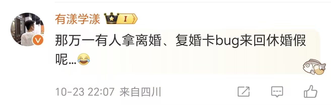 也有網友提到,有的公司規定不管是幾婚,也不管是不是同一個人,婚假在公司只能享受一次。這樣的話基本什麼bug都卡不了了