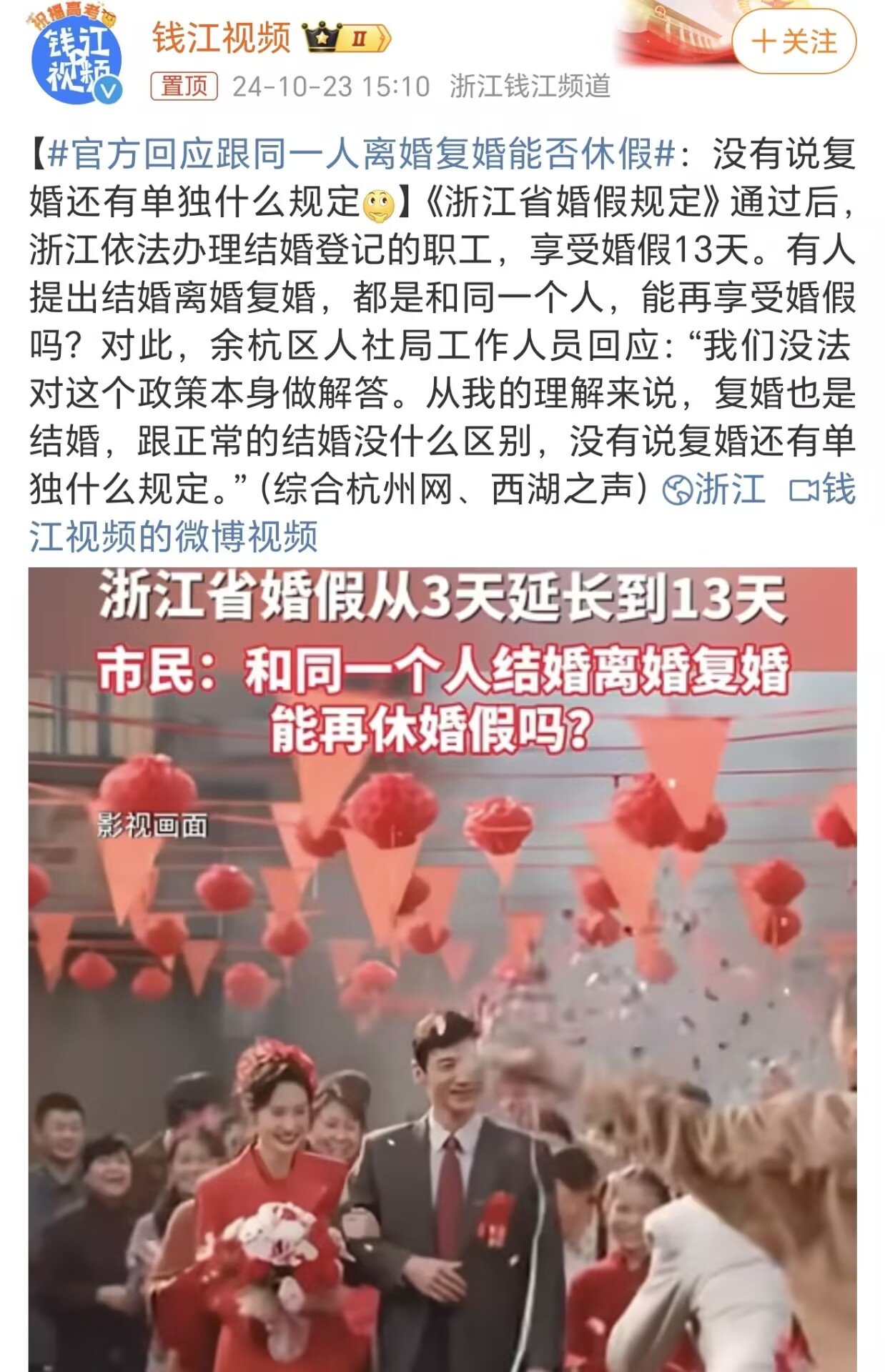 最近有關於離婚復婚能否再次享受婚假的問題引發了廣泛討論。根據《浙江省婚假規定》,依法辦理結婚登記的職工可享受13天的婚假。針對這一情況,有網友提問如果與同一個人多次離婚復婚,是否還能繼續享受婚假。