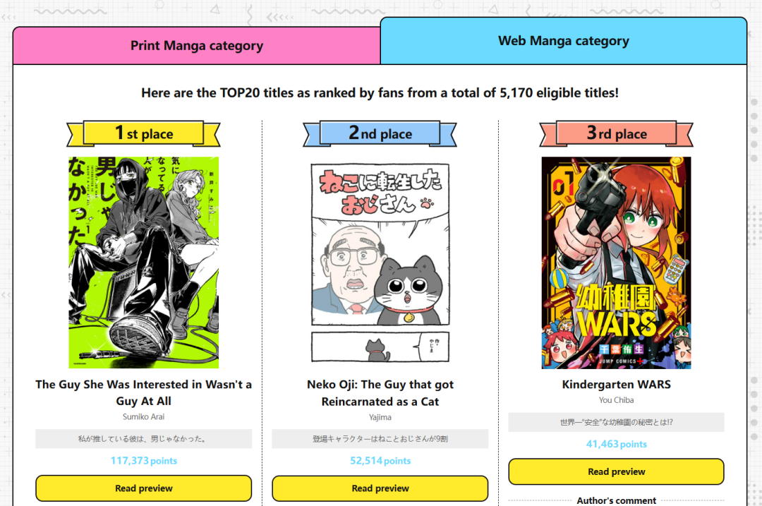 《轉生成貓的大叔》作者やじま於去年2月開始在推特(現X)、Instagram上每日更新相關內容。每一話信息量不大,可能只有一兩張圖,但很有討論度,且內容高頻率更新,使得大叔貓的存在感不弱。翻看作者的社交平台賬號,會發現《轉生成貓的大叔》並非其第一部嘗試系列化的網絡漫畫作品,不過卻是反響最好的一部。同年9月,在以新作為主的大眾票選漫畫獎項“下一部漫畫大賞2023”中,該作獲得了網絡漫畫部門的第二名。