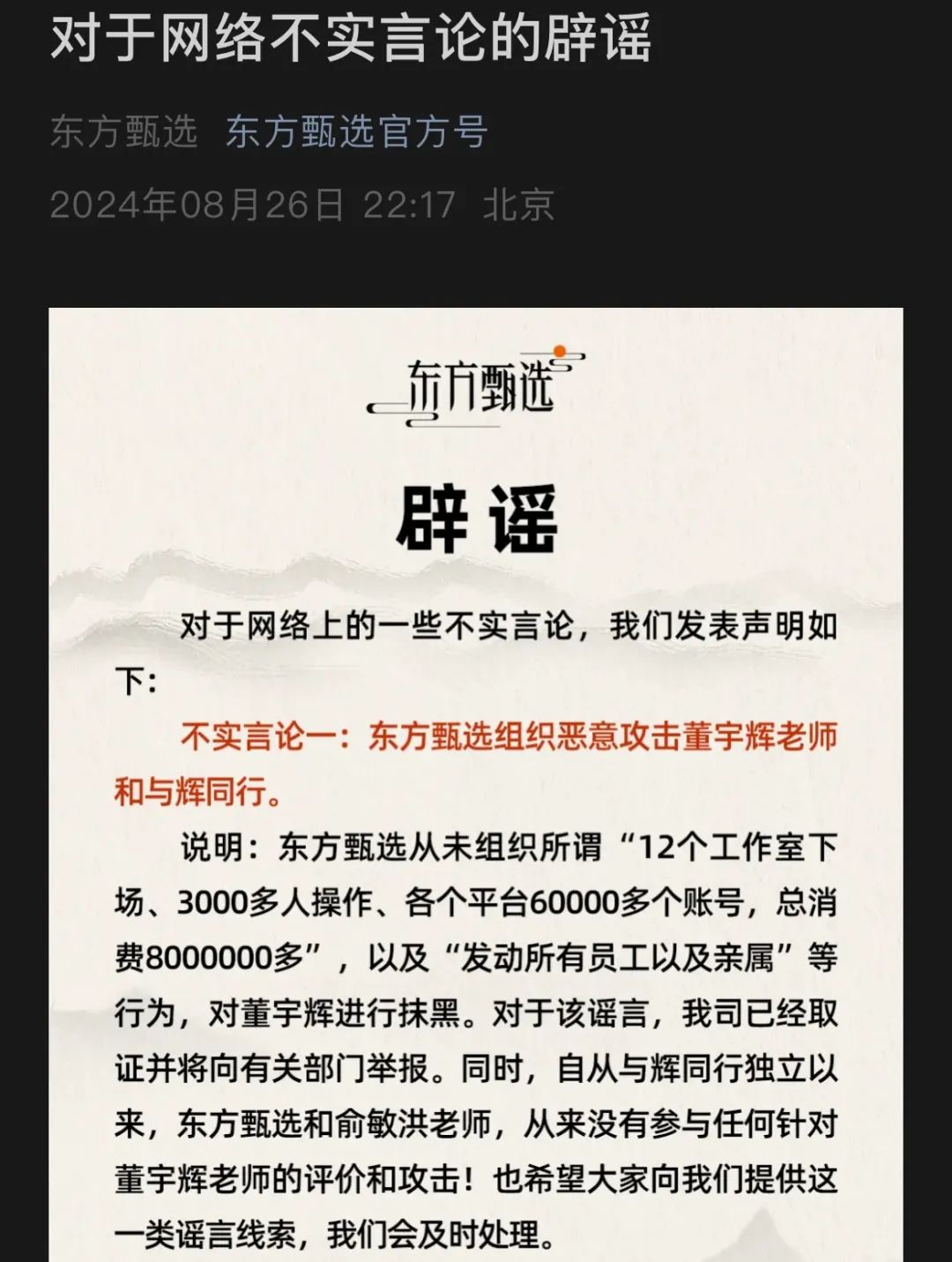 8月26日,東方甄選在微信公眾號發佈關於網絡不實言論的闢謠文章。東方甄選提到,從未組織“12個工作室下場、3000多人操作、各個平台60000多個賬號,總消費800多萬元”,以及採取“發動所有員工以及親屬”等行為,對董宇輝進行抹黑。對於該謠言,公司已經取證並將向有關部門舉報。同時,自從與輝同行獨立以來,東方甄選和俞敏洪,從來沒有參與任何針對董宇輝的評價和攻擊。