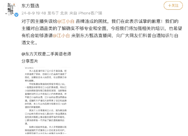即便不談外部環境,東方甄選自身,也並不那樣四平八穩。在八月初,東方甄選主播天權在東方甄選直播間表示江小白不是白酒,引發後者激烈回應。之後,東方甄選主播天權發佈道歉信,稱其在直播時説了江小白不是白酒,給大家造成了誤會,也給江小白品牌方造成了困擾,隨後,東方甄選官方微博也發文表達歉意。