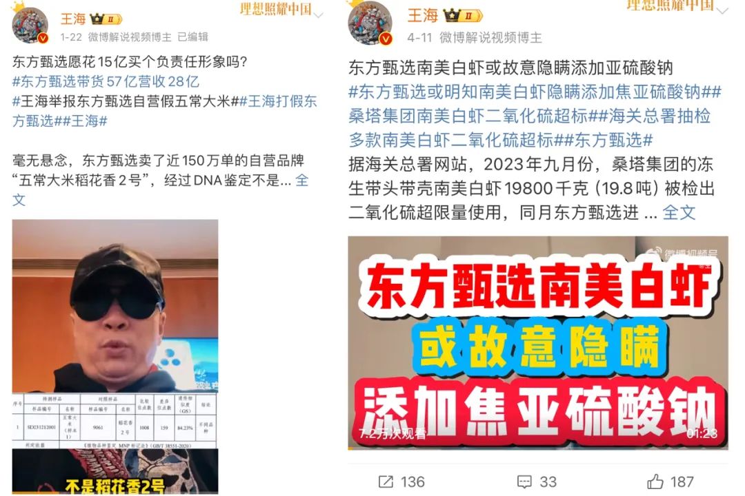 不僅如此,自東方甄選走紅以來,圍繞着它的食品安全爭議多次出現。在2024年,知名打假人王海先後爆料了東方甄選自營的“五常大米稻花香2號”並非稻花香2號,自營厄瓜多爾南美白蝦隱瞞添加,超量使用蝦藥(防腐劑、漂白劑)焦亞硫酸鈉。科普博主“水果獵人楊曉洋”也透露其銷售金桔時涉嫌虛假宣傳行為。