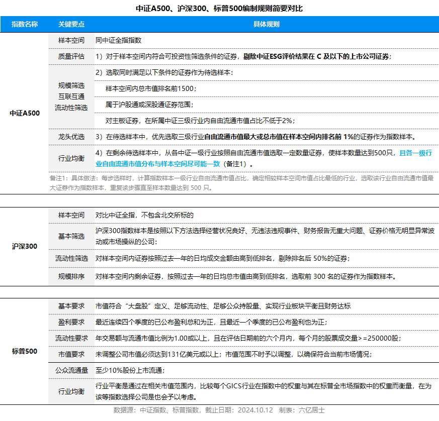 圖2詳細對比了中證A500、滬深300和標普500的編制規則差異,我們看重點: