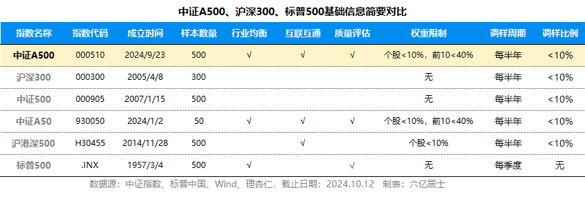 首先,我們先來簡要對比一下中證A500與其他相關指數的基礎信息: