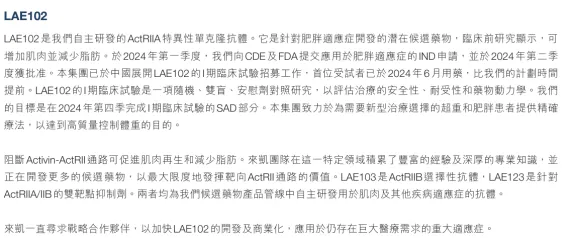 據悉,LAE102是來凱醫藥自主研發、全球首創的一種單克隆抗體,可與GLP-1受體激動劑聯用,達到減少脂肪並降低肌肉流失的效果。