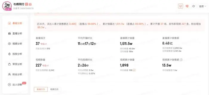 不過,爭議並沒有影響與輝同行的銷量。蟬媽媽數據顯示,近30天,在董宇輝的帶領下,與輝同行的帶貨銷售額達8.48億,累計銷量達1511.7w,場均銷售額超2000w,位列達人帶貨月榜第一名,截至10月23日,直播間粉絲數已經達到2434.5萬。