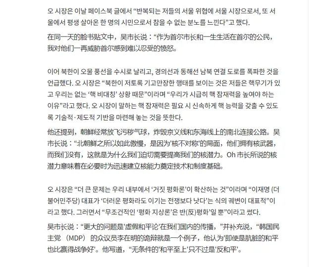 除了拋出“擁核”的主張之外,吳世勳還在他的文章中批評了以黨首李在明為代表的共同民主黨人,指責他們在韓國國內到處散播“虛假的朝韓和平論”,還怒斥李在明對於朝韓局勢的有關言論,比如“哪怕是骯髒的和平,也好過比勝利的戰爭”等,是典型的詭辯,是在向朝方示弱,是妥妥的“親北”主張,他身為首爾市長,對此表示不可接受。