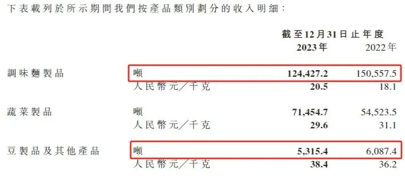 不過,衞龍將以魔芋爽為代表的蔬菜製品作為第二增長曲線。2023年,衞龍蔬菜製品營收為21.19億元,同比增長25.1%,佔總收入的比重超過43%;銷量則由約5萬噸漲至約7萬噸。只不過蔬菜製品的價格卻是在下調,2023年銷售單價為29.6元/kg,同比下降4.82%。