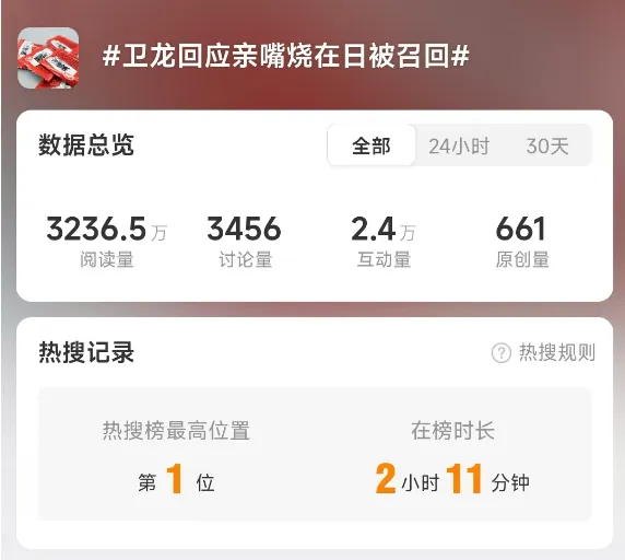 近日有消息稱,因被檢測出日本禁用的食品添加劑TBHQ,超43公斤的衞龍親嘴燒產品在日本被召回,相關話題登上熱搜第一。