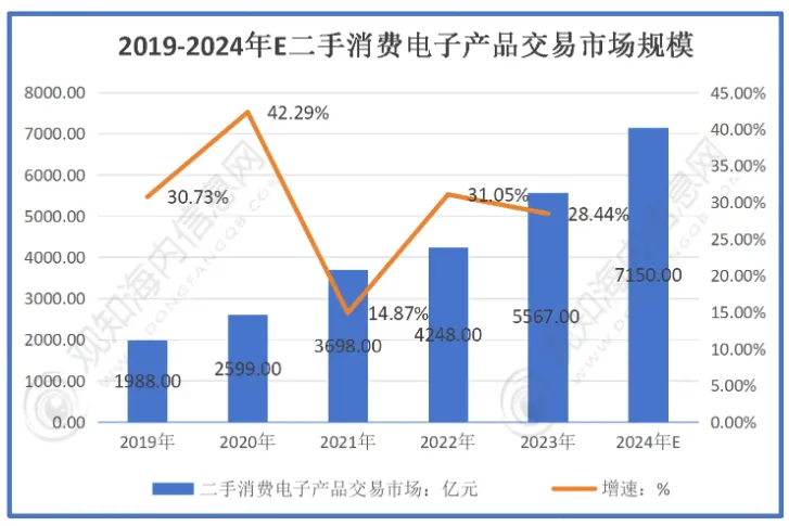 中商產業研究院發佈的《2024-2029年中國二手消費電子行業市場前景預測及未來發展趨勢報告》顯示,2019年中國二手手機交易規模1648億元,2023年增至4156億元。中商產業研究院分析師預測,2024年中國二手手機交易規模5254億元。