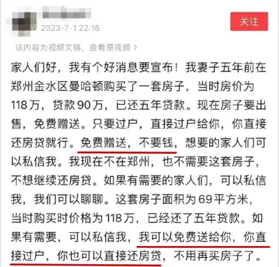 去年,網上有個大哥宣佈要“白送”自己在鄭州的一套房子,引發大量關注。