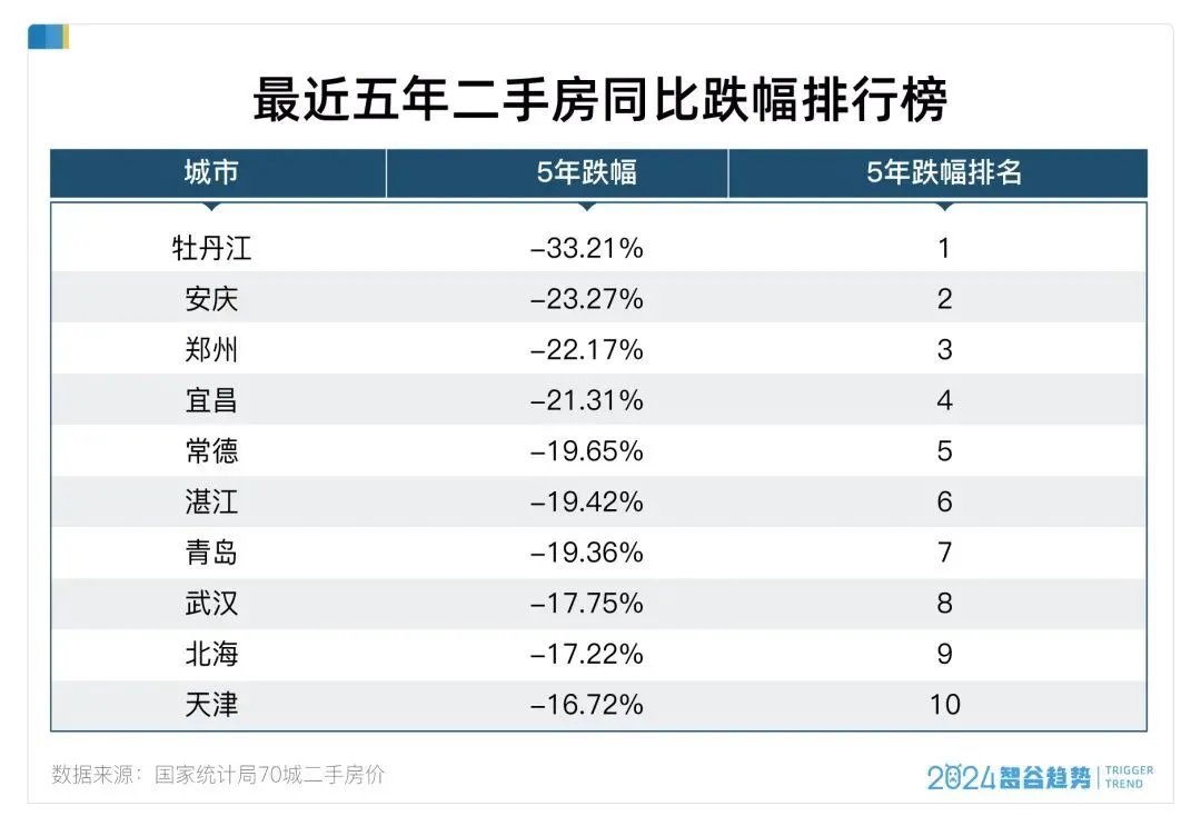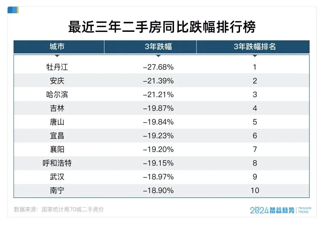 除了哈爾濱的東北debuff,像鄭州、南寧、武漢,鄭州5年跌幅22.17%,排名第三;南寧3年跌18.90%,排名第十;武漢3年跌18.97%,排名第九。