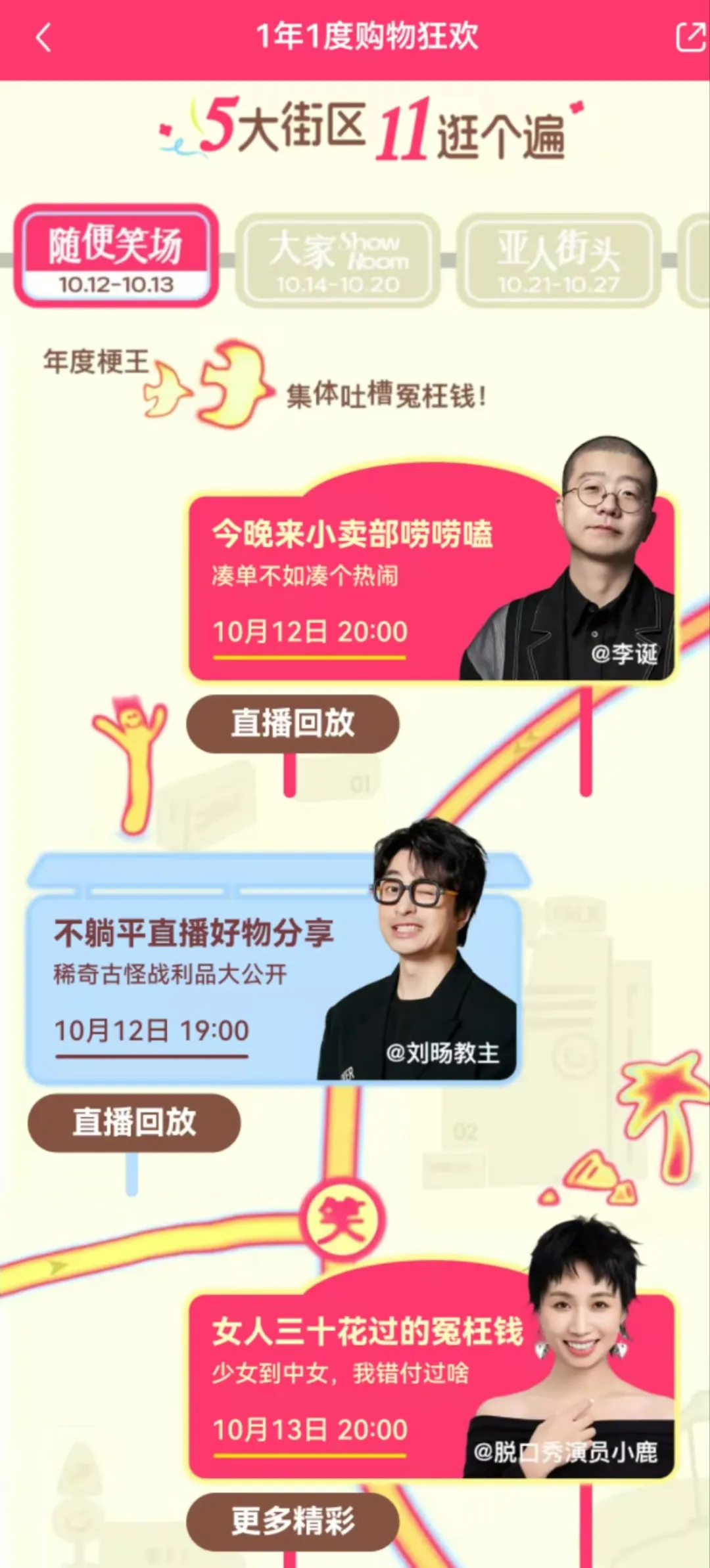 為了打造“1年1度購物狂歡”的IP,小紅書將“市集”的概念搬至線上,圍繞着平台上的1000+家生活方式寶藏店鋪,打造了五個主題街區——隨便笑場、大家showroom、亞人街頭、衝動酒吧、樂透狂歡,根據每個街區的不同主題邀請了脱口秀演員劉暘、楊笠,乒乓球世界冠軍許昕等人分享好物,一起逛買。