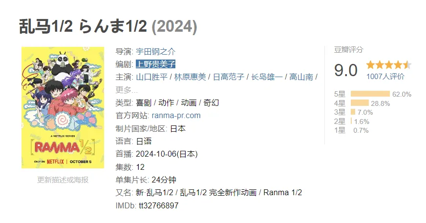 前幾日,本花為大家介紹了一下重置版《亂馬1/2》,它已經從開分的8.9,上漲到了現在的9.0,可見內容越播越精彩了。