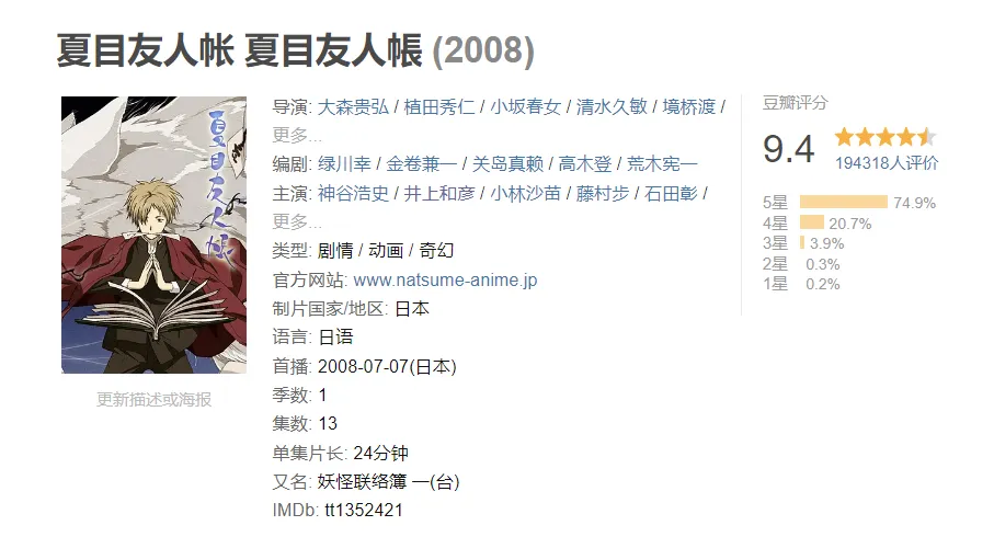 但這並非是指《夏目友人帳》不受歡迎的意思,那可是首季近20萬人開出9.4的動畫神作啊喂!