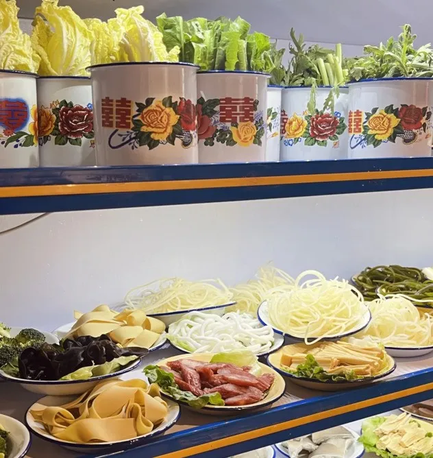 冰櫃裏擺放着各式的肉類和下水類菜品,品質還行,且價格比較實惠,顧客端着托盤進屋選菜,39塊9,可以吃到一斤素菜和一斤葷菜,葷菜隨便拼,也可只拿毛肚或者牛肉,店家不管這個。