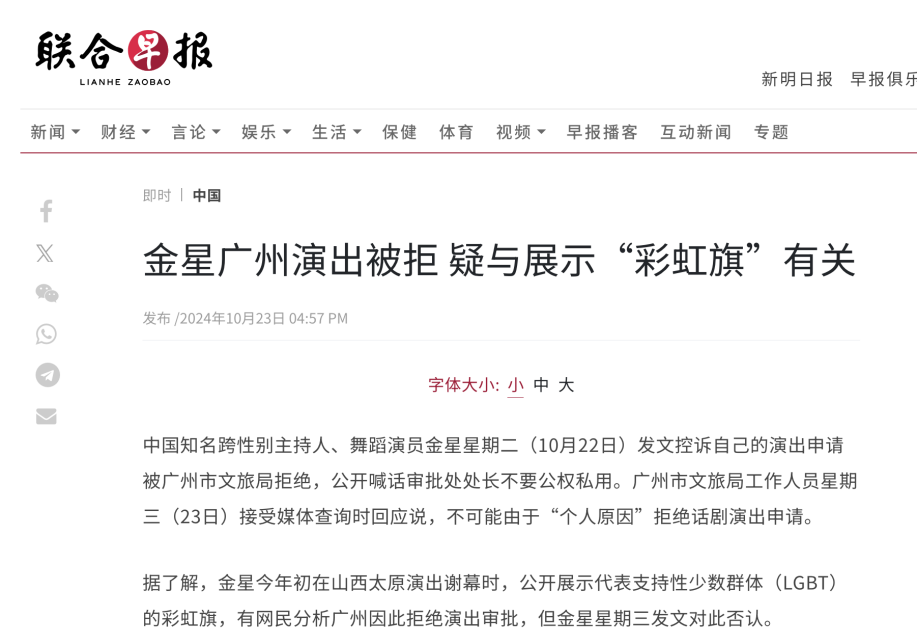 當然,網友僅從網絡上的隻言片語找不到更具體的原因,這也是給各種消息傳播的具體空間。但發生這樣的事情也絕非突然。有網友指出,金星被拒絕的原因是因為在早前的一次演出中,她舉出了象徵LGBT符號的彩虹旗。這一點也成為了部分外媒理解的方向。