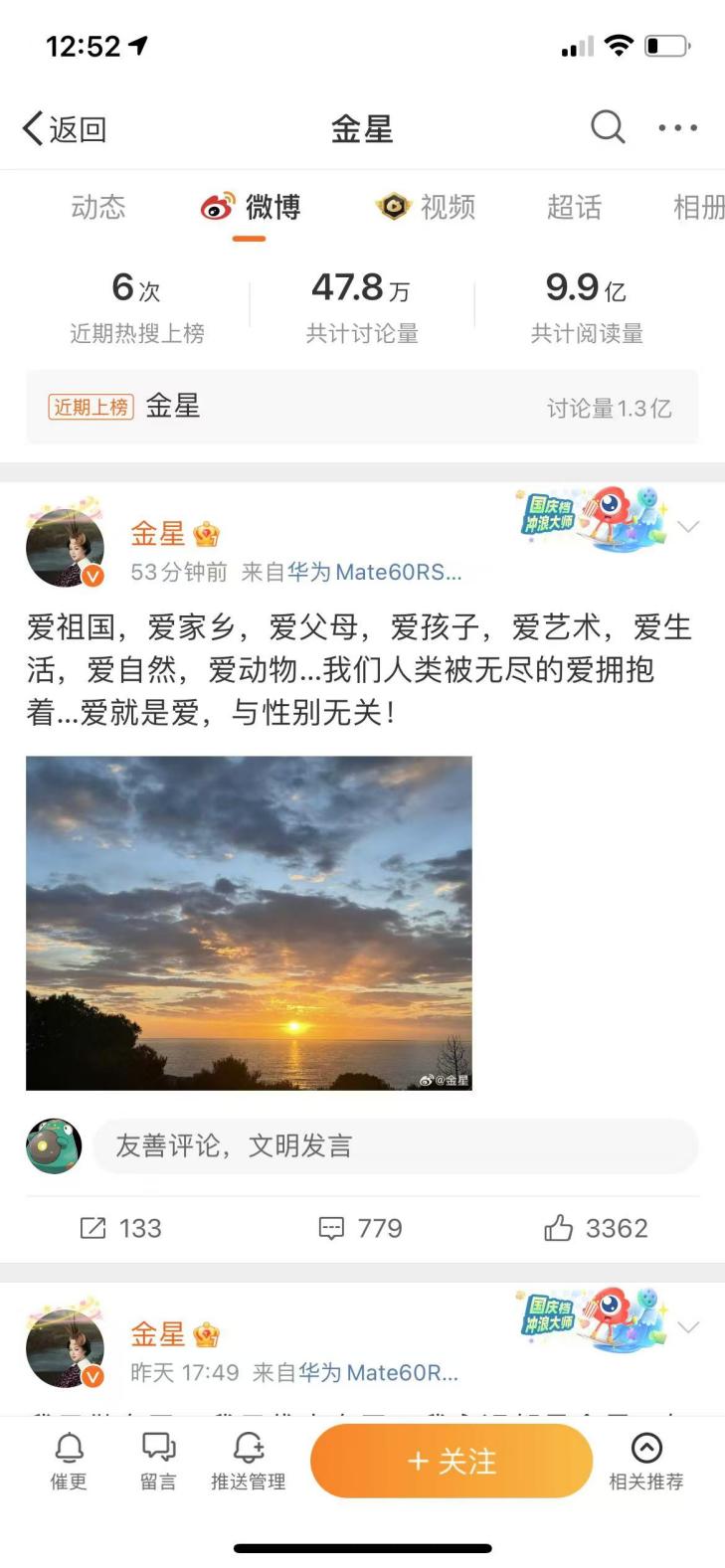 24日中午,金星再次發文,稱“愛祖國,愛家鄉,愛父母,愛孩子,愛藝術,愛生活,愛自然,愛動物..我們人類被無盡的愛擁抱着….愛就是愛,與性別無關!”