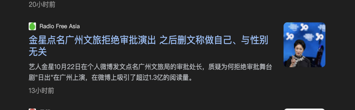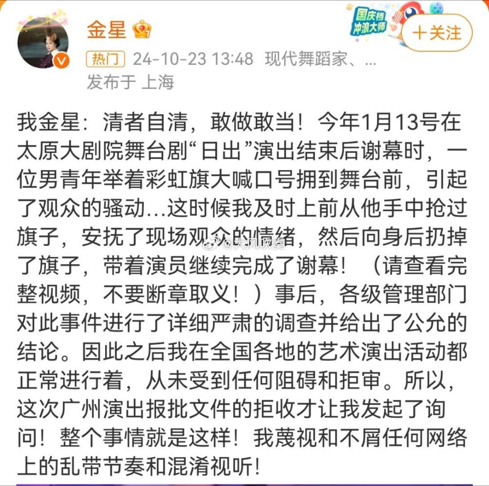 10月23日,金星在其個人微博上表示,自導自演的話劇《日出》的表演申請被廣州市文旅局拒絕。她質疑是該局某位領導的“個人原因”導致演出沒有獲得批准,屬於“公權私用”,並要求廣州市文旅局出示上級部門的紅頭文件。由此引發了輿論上的波動。