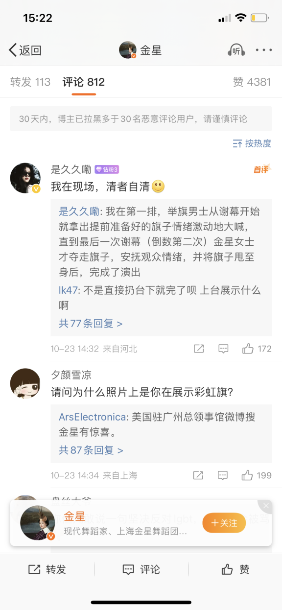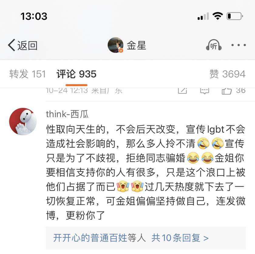 事實上,從保留的兩條微博上看,金星已經兩次明確在微博上喊出完全具有LGBT政治宣傳的內容符號了,我個人更願意相信這是金星本人在被氣破防之後的無奈之舉。不然,網友的質疑只會更多。當然,面對網友的質疑,金星還是選擇了堅持自我。