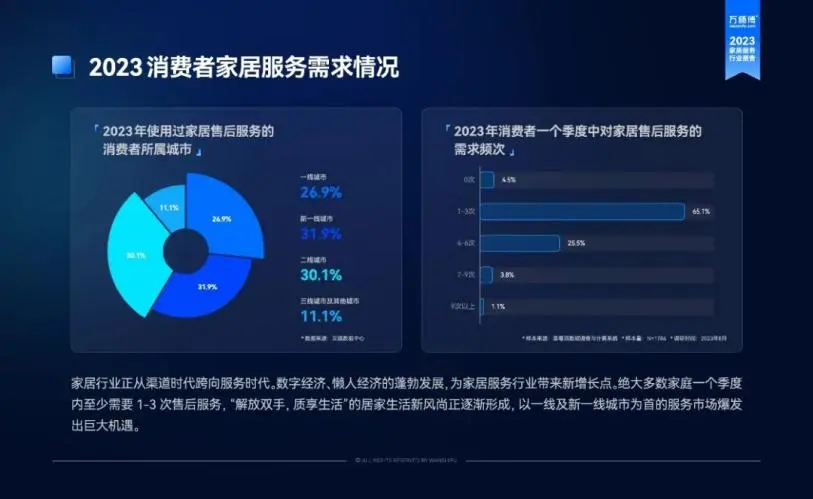 家庭維修這行不同於其他行業,用户的消費頻次並不高。《2023家居服務行業洞察報告》顯示,超六成的家庭每季度僅需要1次至3次的家居售後服務,需求頻次在4次及以上的比例為30.4%。