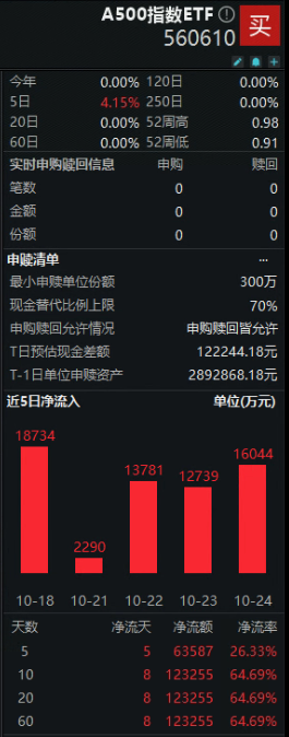 在這種背景下,首批中證A500ETF上市以來,“吸睛”無數。截至10月24日,A500指數ETF(560610)獲資金連續8日淨流入,累計淨申購額超12.3億,基金最新規模超30億,創上市以來新高。