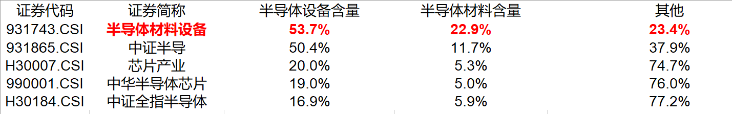 梳理各主流半導體指數,半導體材料設備指數成分較為純粹,聚焦半導體設備和材料,同時,半導體設備含量最高,有望充分受益AI芯片需求擴張的復甦行情。