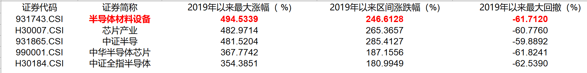 同時,半導體後市反彈勢能足,在各主流半導體指數中間,半導體材料設備指數彈性更為明顯。截至10月18日,2019年以來, 半導體材料設備指數最大漲幅達到494.53%,區間累計漲幅達到246.61%。(數據來源:Wind)