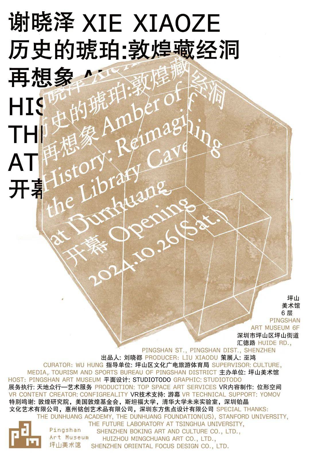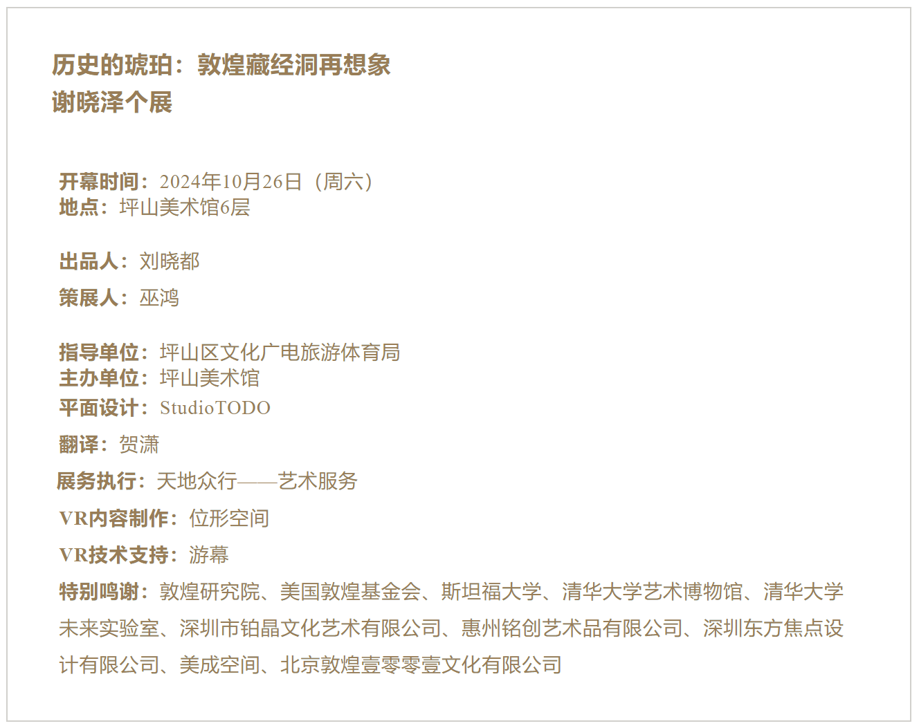 藝術家謝曉澤個展“歷史的琥珀:敦煌藏經洞再想象”,即將於2024年10月26日在坪山美術館呈現。展覽將展出藝術家2017年至今創作的多件作品,其中涵蓋紙本水墨、雕塑、裝置、VR沉浸式體驗等多重媒介。
