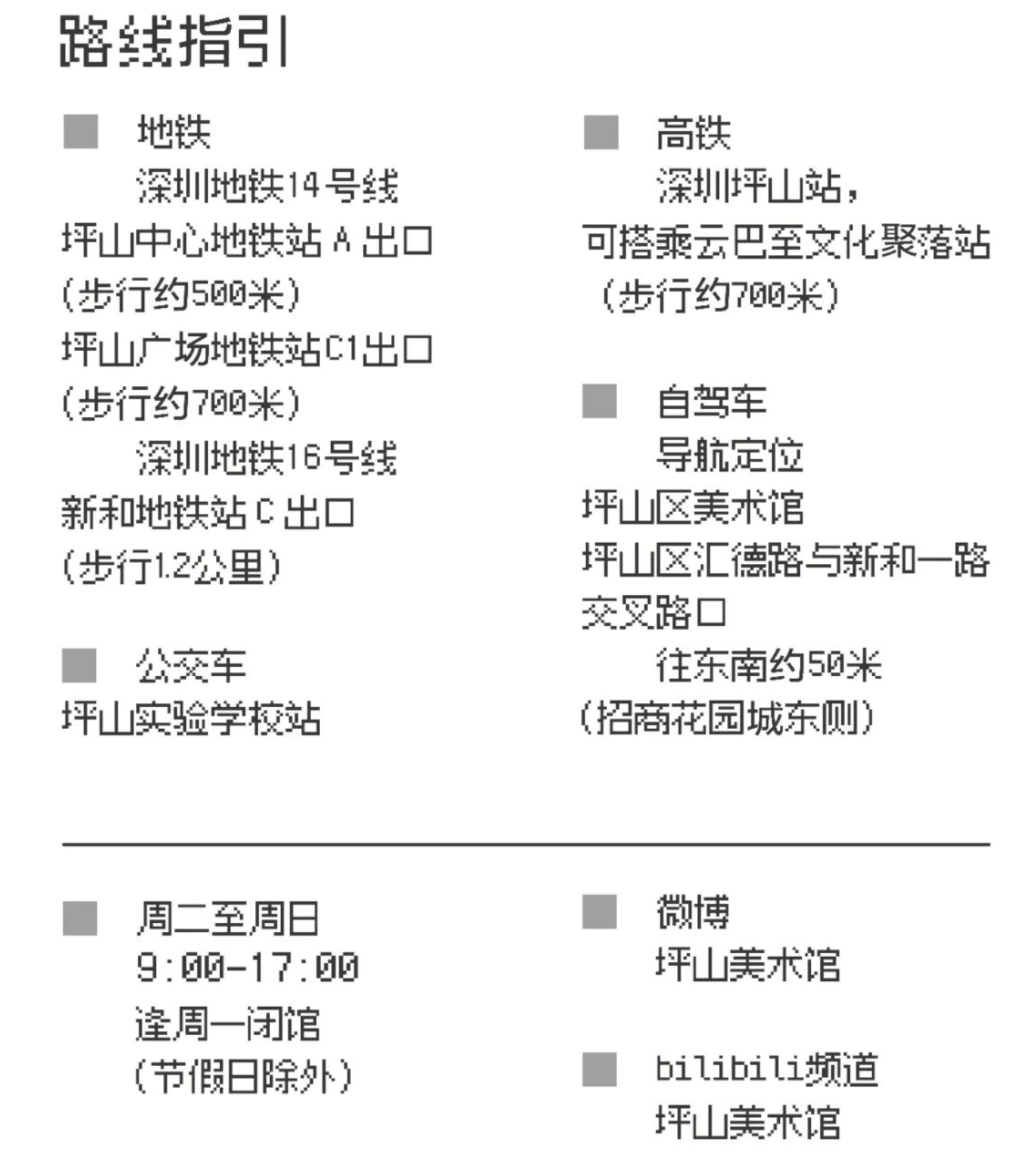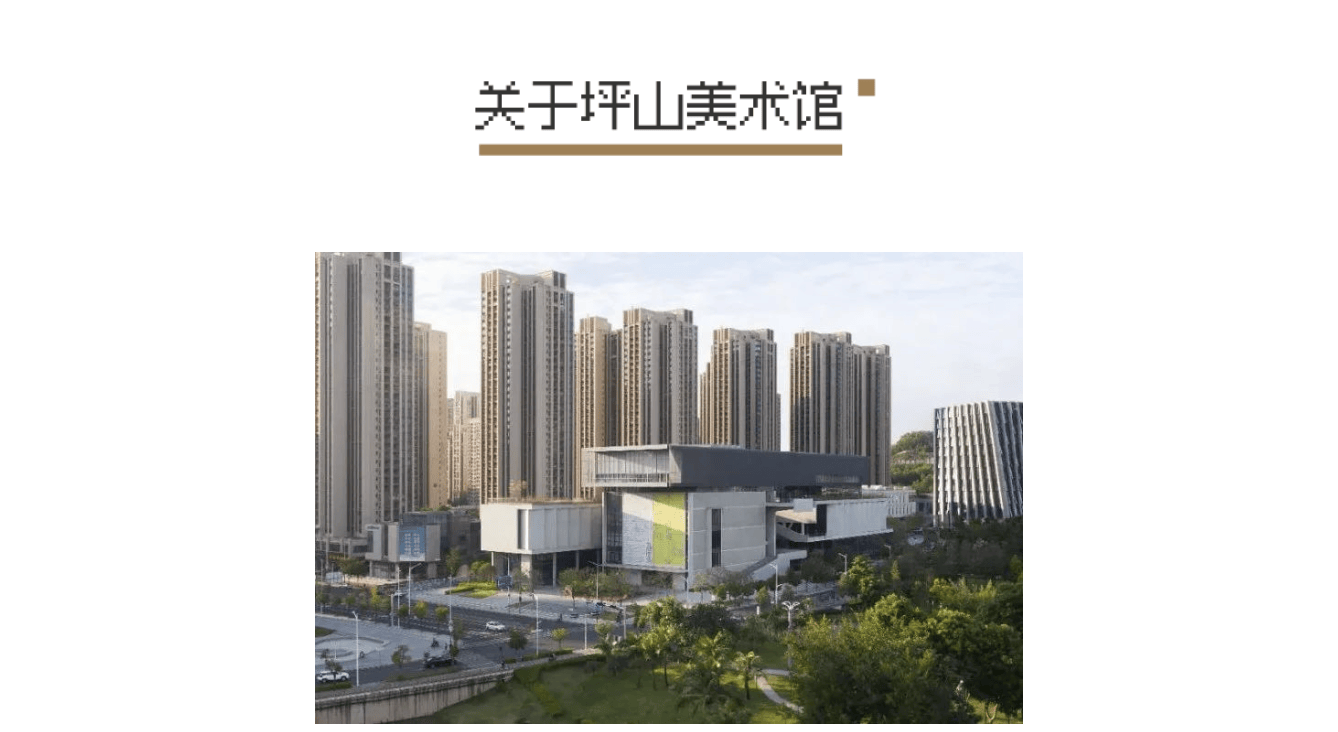 坪山美術館位於坪山文化聚落北區,是深圳重要的公共文化設施。坪山美術館以創新的體制機制,推動傳統公立美術館與民間美術館的資源融通,匯聚各方能量,辦一個專業化、品質化、國際化的“正而酷”的美術館,成為集活力、包容、創意、互動為一體的新時代新都市美術館新標杆,為市民羣眾帶來新鮮、多元的文化享受和體驗。
