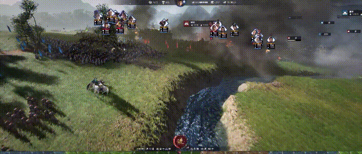 除了地圖,PV還展示了為數不多的戰鬥場景。從展示的畫面看,戰鬥將直接在大地圖上以兵團對抗的形式展開。騎馬的武將捉對廝殺,士兵們則各自打成一團。刀兵對戰的動作拉近去看也非常清晰。而交戰區域的火光沖天,也説明了交戰雙方是可以使用火計一類的計策來影響戰場局勢的。