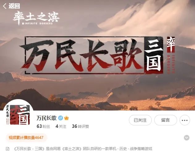 根據《萬民長歌:三國》官方賬號的頁面信息顯示,這款遊戲將是由網易《率土之濱》團隊自研的一款單機 · 歷史 · 戰爭策略遊戲。