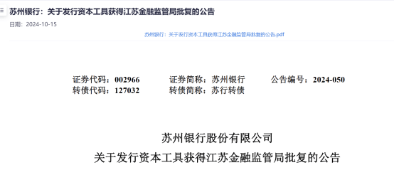 10月14日,蘇州銀行(002966.SZ)公告稱,近日收到《江蘇金融監管局關於蘇州銀行發行資本工具的批覆》,同意該行發行不超過170億元人民幣的資本工具,品種為二級資本債和無固定期限資本債券。