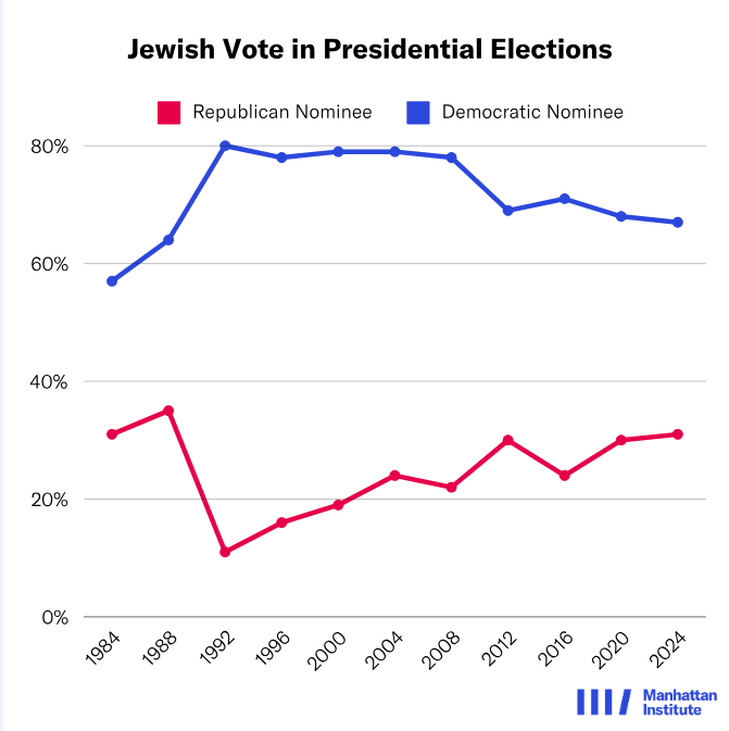 本次大選依然如此。在關鍵的七個搖擺州里,71%的猶太人選民是支持哈里斯的。