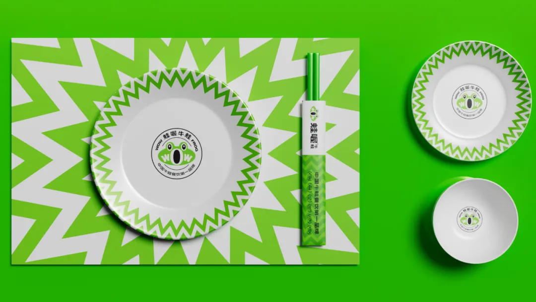 同時還要考慮後端製作,一切迴歸目的。如果做一個東西,最後別人識別不了,那就完蛋了。所以我們的編碼、解碼要清晰準確,不要產生歧義。這裏我設計了一個粗壯有力的黑體,因為“中國牛蛙餐飲第一品牌”,一定要有力量感,同時要有年輕時尚的動感。