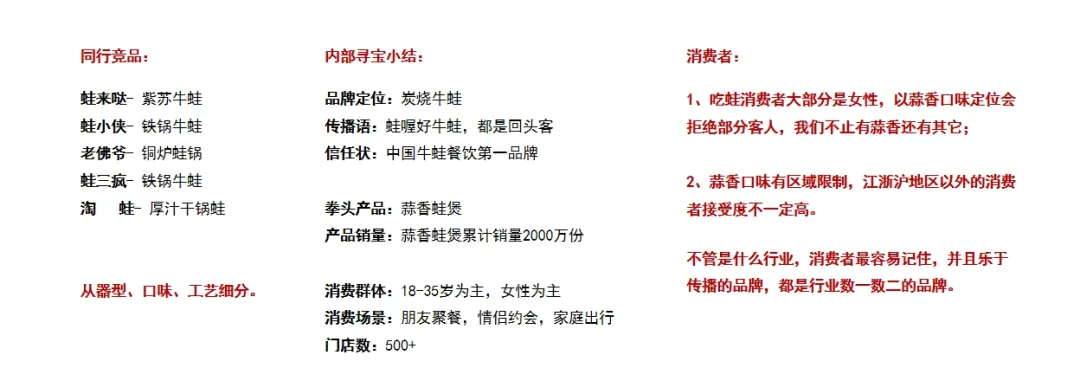 比如蛙喔,品牌定位:炭燒牛蛙;傳播語:蛙喔好牛蛙,都是回頭客;信任狀:中國牛蛙餐飲第一品牌;拳頭產品:蒜香蛙煲。