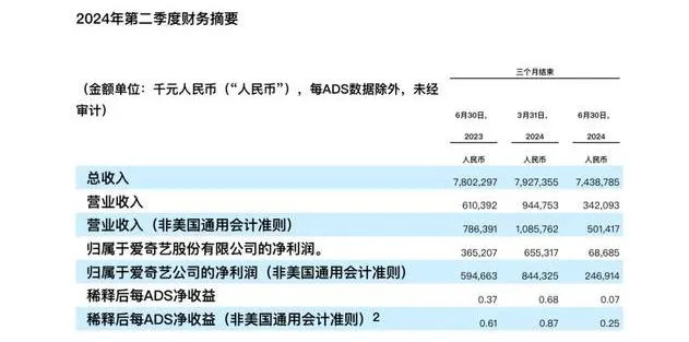 從數據上來看,愛奇藝發佈的今年第二季度財報顯示,該季度總收入74億元人民幣,同比下滑5%。歸屬於愛奇藝的淨利潤為6870萬元,而2023年同期淨利潤為3.652億元,同比下跌 81%。不按美國通用會計準則,歸屬於愛奇藝的淨利潤為2.469億元,而2023年同期淨利潤為5.947億元。當天美股盤前,愛奇藝股價下跌2.6%至3美元。