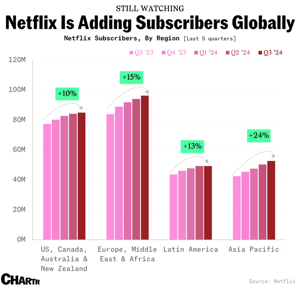圖中可以看到,在全球各個區域,Netflix 的付費訂閲用户年增長(YoY)達到了兩位數的比率。