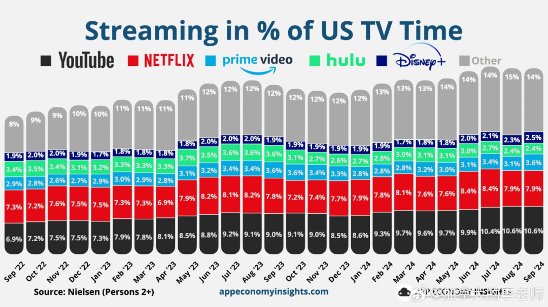 根據尼爾森2024年9月的市場調查數據,流媒體目前佔美國居民電視時間的41% ,與去年相比增加了3.5%,其中各個服務商的佔比如下: