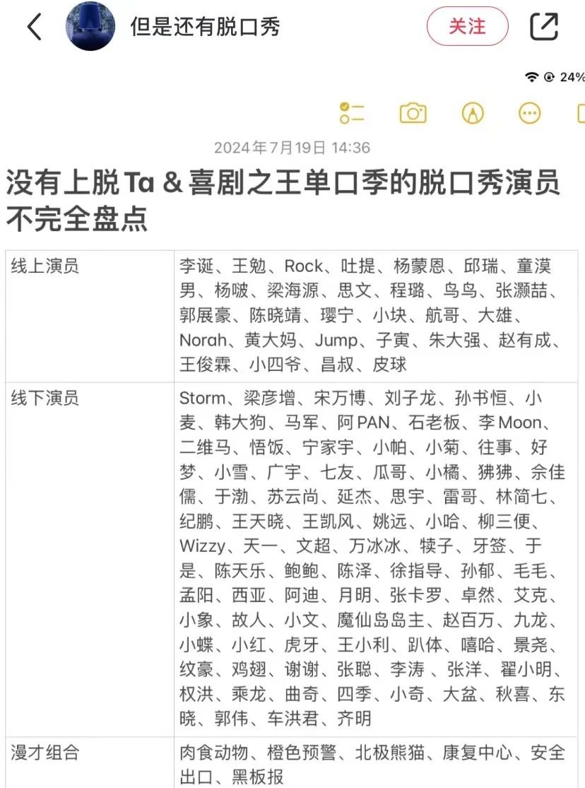 “線上”、“線下”的分類當然不夠嚴謹,更主要指的是觀眾對他們有認知的主要渠道,真正的脱口秀演員是不能離開線下的。雖然具體原因不得而知,“但是還有脱口秀”推測這些演員不參加節目的理由大致可分為以下幾類:不再需要用節目證明自己;忙於專場巡演不想消耗段子;段子不適合線上或演員明確知道自己不適合比賽;在幕後做編劇;賽道已轉換;作為地下演員的傲骨。