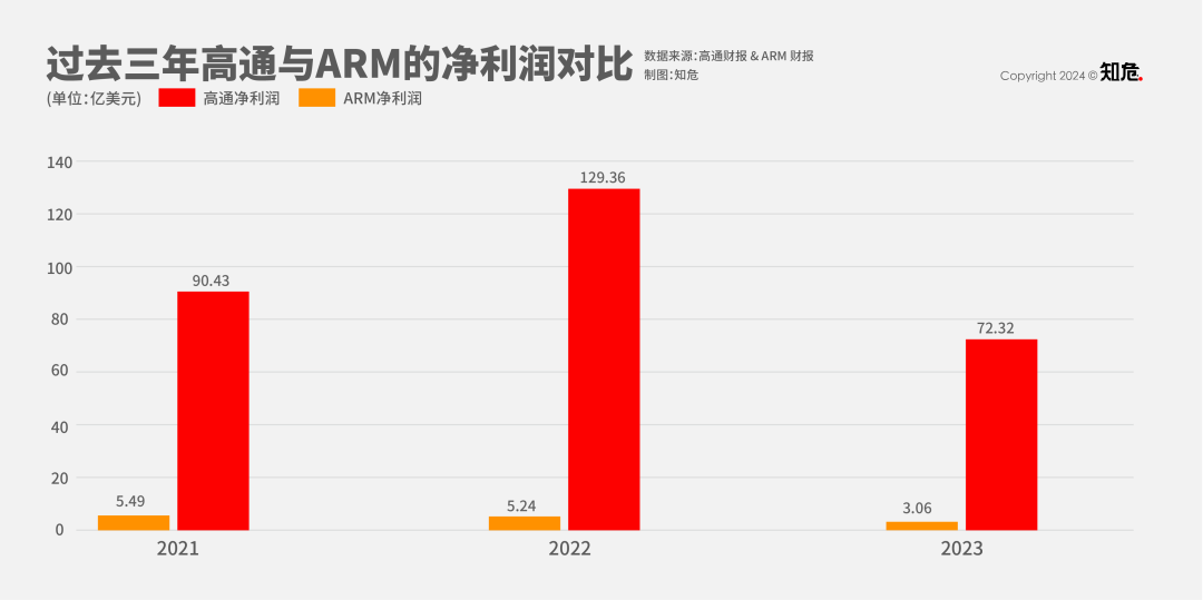 比如,過去三年,ARM 跟高通的淨利潤完全都不在同一個數量級: