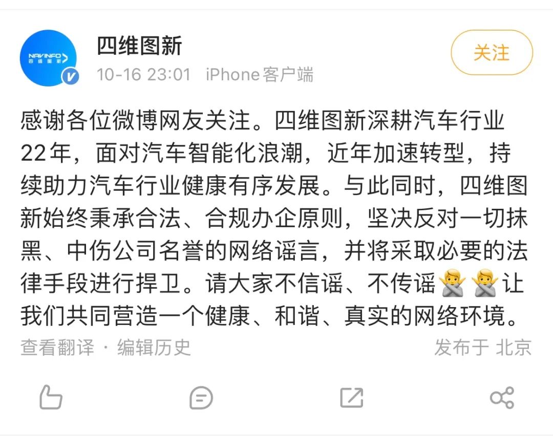 不過很快,四維圖新進行了回應。其在官方微博發佈了聲明,強調其一貫秉持合法、合規的經營原則,並堅決反對一切抹黑、中傷公司聲譽的行為。