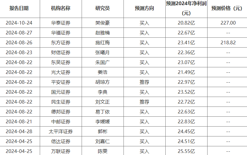 對應估值預測,2024年最高目標價為227.00元,最低目標價為218.82元,平均為222.91元。按照其目前208.7元的股價來説,短期當前位置相對合理。