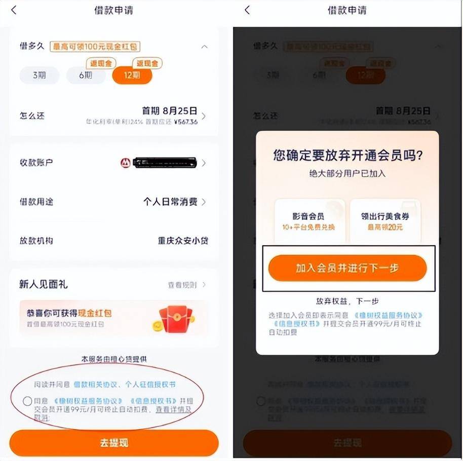 倘若用户不勾選相關協議,直接點擊“去提現”,跳轉頁面則會提示開通會員後享有的影音會員、出行美食券等權益,並將“加入會員並進行下一步”內容加粗放大,繼續對用户進行開通會員誘導。