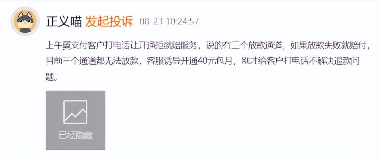 “翼支付借錢平台誘導我開通40元月卡,聲稱共有三個放款通道,如果放款失敗就向用户發起賠付,但目前三個通道都無法放款,且客服拒絕解決月卡退款問題”,在黑貓投訴平台上,關於翼支付虛假宣傳、誘導收費的投訴屢見不鮮。