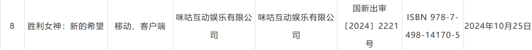 另一方面,依據此次披露的過審信息,《勝利女神:新的希望》由咪咕擔任出版與運營單位,而不是大家預想中的騰訊。