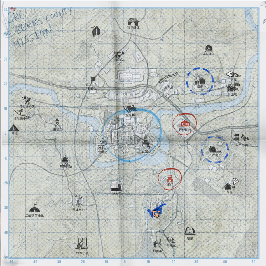 玩家出生時只有一根鋼管和一把左輪手槍,必須通過搜刮周邊據點讓自己發育起來。將附近的小型據點刮乾淨地皮,能夠獲取基礎物資;用深藍色虛線圓圈標記的中型據點會有支線任務,完成任務解鎖貯藏室,即可取出足夠武裝三四個人的武器彈藥。