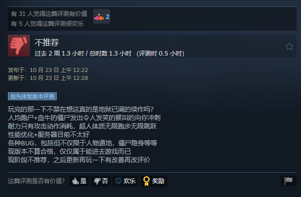 前作《地獄已滿1》可沒受過這種氣,這款同樣打着硬核標籤的打殭屍遊戲,Steam好評率高達89%,有6萬5千名玩家曾為其打出好評。